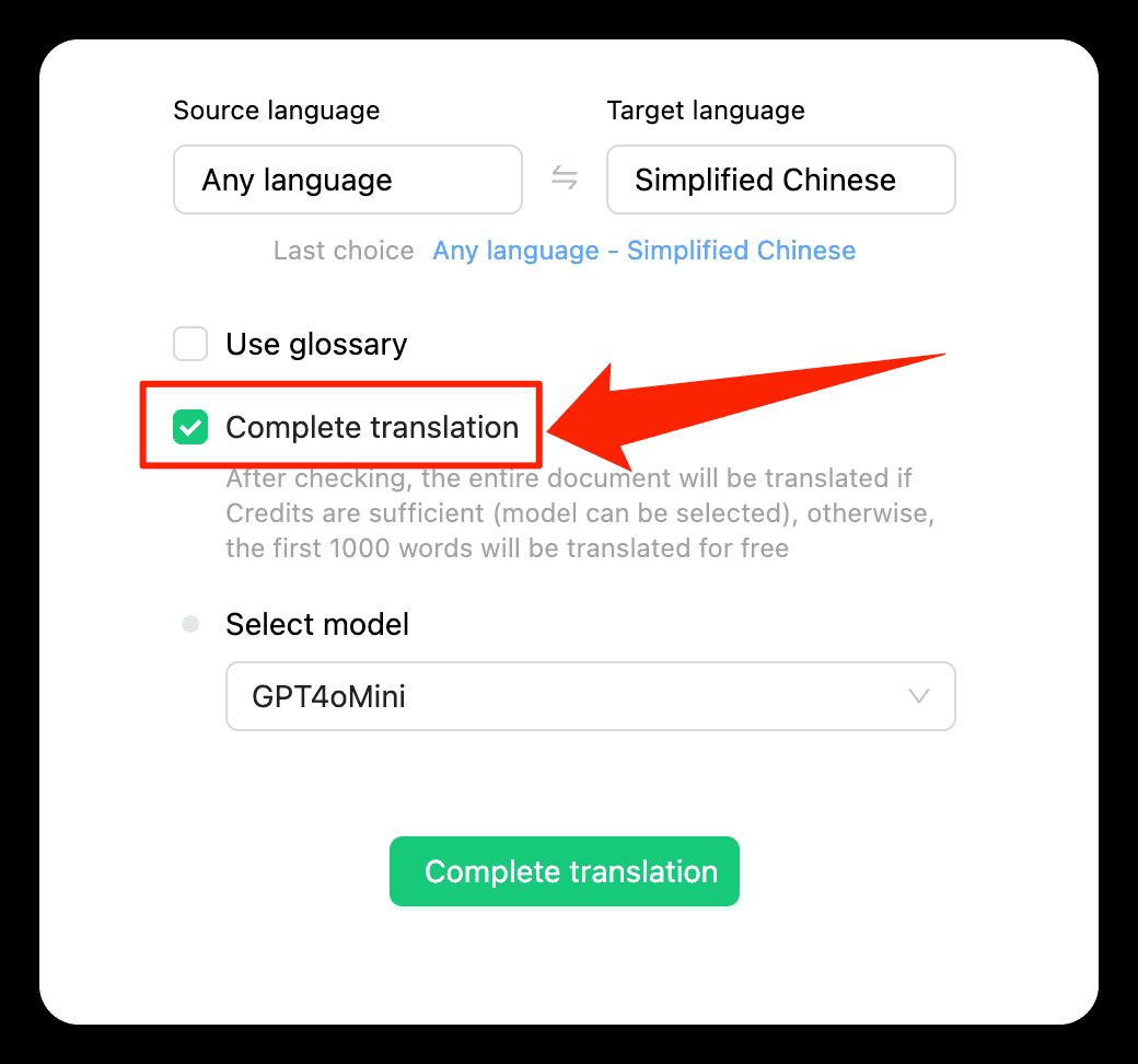 用户在启动翻译时,可直接勾选“全文翻译”选项。